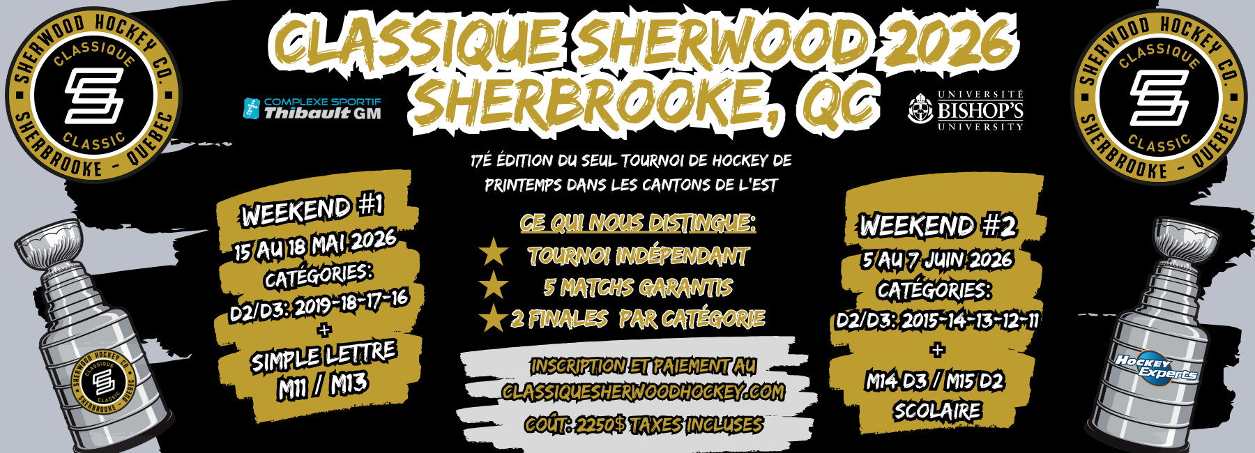 Plusieurs nouveauté pour célébrer les 17 ans de la Classique Sherwood Hockey de Sherbrooke. De nouveaux partenaires à être annoncés dans les prochaines semaines. Nous pouvons maintenant confirmer que le tournoi innove en offrant un minimum de 5 matchs garantis par équipe pendant le tournoi. Nous ouvrons également deux nouvelles catégorie soit le M13 D1, le M14 D3 et le M15 D2 scolaire. Les weekend du 15-16-17-18 mai pour les catégories 2020-2019-2018-2017-2016 (D2-D3) ainsi que simple lettre M11 et M13. Le 2e weekend verra à l’oeuvre les catégories 2015-2014-2013-2012-2011 ainsi que le M14 D3 et le M15 D2. Les activités se dérouleront principalement au Complexe Sportif Thibault GM de Sherbrooke, à l’aréna Jane et Éric Molson de Bishop’s University ainsi qu’au Complexe Sportif Forage FTE de l’arrondissement Rock Forest.